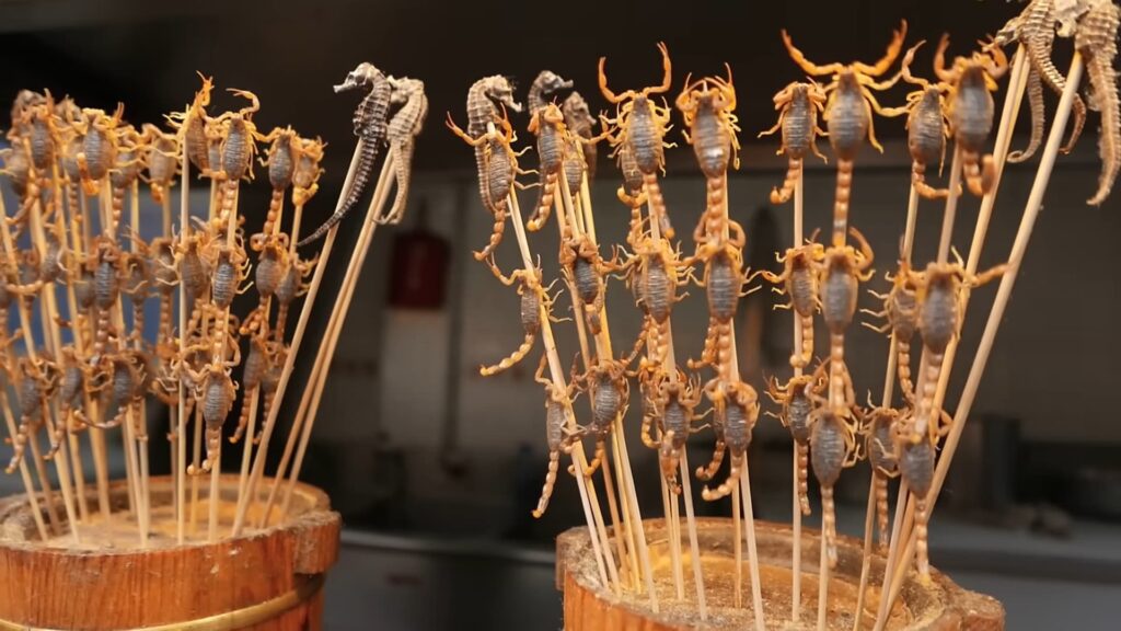 Пожалуй, это первое, о чём думают люди, когда речь заходит о китайском стритфуде. И да — это реальность, а не туристическая легенда. На рынках Пекина, Чэнду и Сианя можно запросто купить шпажку с жареными скорпионами, сверчками, шелкопрядами, личинками и даже морскими коньками.