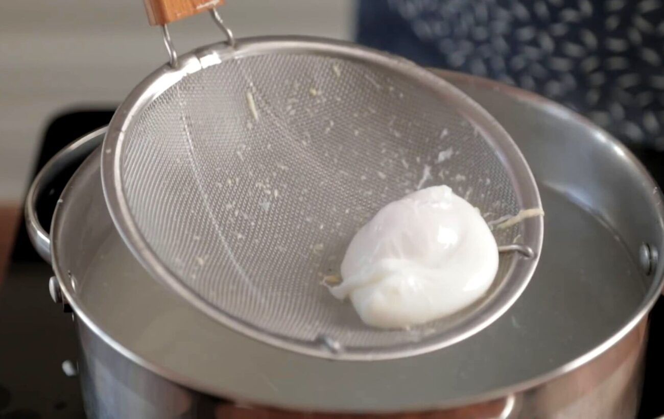 6 Done | Теперь сделаем яйцо пашот. Для этого разбиваем его на мелкое сито и даем стечь самой жидкой части белка. Тогда яйцо будет аккуратнее. |