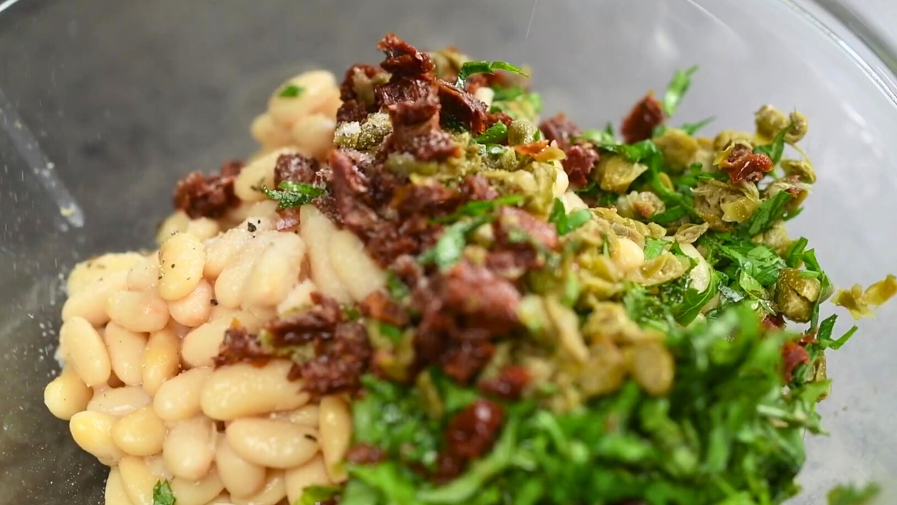 5 Done | В миске тщательно смешиваем фасоль + нарезанную зелень, вяленные помидоры, каперсы, оливковое масло, соль и перец. |