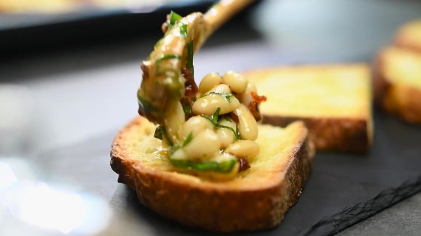 6 Done | На поджаренный чесночный хлеб выкладываем столовую ложку фасоли. |