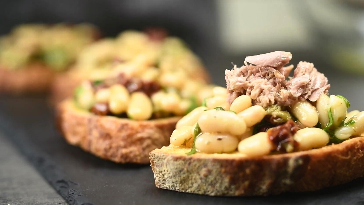 7 Done | Сверху аккуратно кладем примерно чайную ложку тунца. Готовые бутерброды подают сразу, пока хлеб еще хрустящий. Приятного аппетита. |