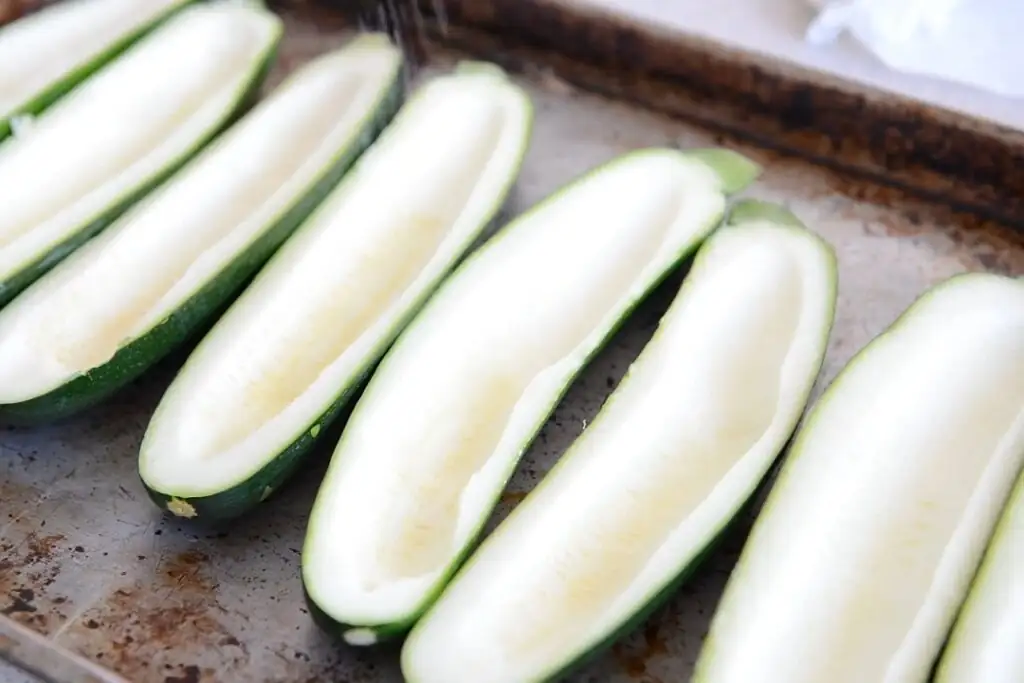Подготовленные кабачки положите на противень, посолите и поперчите. Включаем духовку на 200 градусов. Пока она нагревается, приготовим начинку для кабачков.