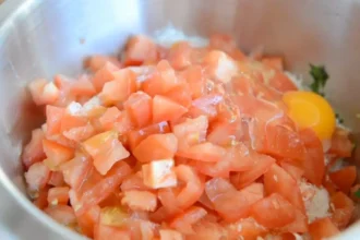 К ним добавляем обжаренные колбаски, нарезанные небольшими кубиками помидоры, рубленый чеснок, панировочные сухари, яйцо и натертый пармезан. Затем солим, перчим и перемешиваем все ингредиенты до однородной массы.
