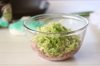 Добавьте капусту в миску с фаршем. Затем нарежьте мелко зеленый лук и смешайте с ингредиентами. Зубчик чеснока натрите на мелкой терке. Все продукты хорошо перемешиваем до получения однородной массы. Добавляем соевый соус, кунжутное масло, имбирь и еще раз хорошо вымешиваем фарш.