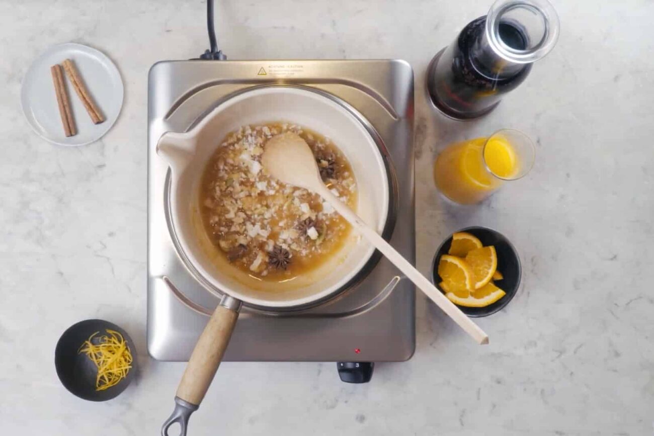1 Done | В посуду для приготовления глинтвейна насыпьте сахар, добавьте анис, кардамон, гвоздику и на маленьком огне карамелизируйте сахар, помешивая массу ложкой. |