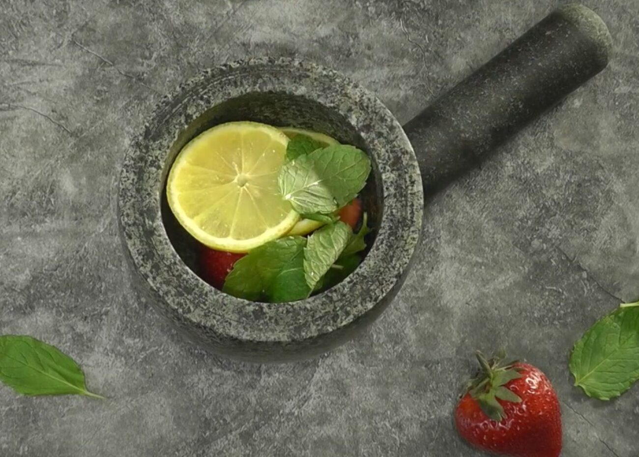 1 Done | Нарежьте клубнику на 2 части и положите в ступку. |