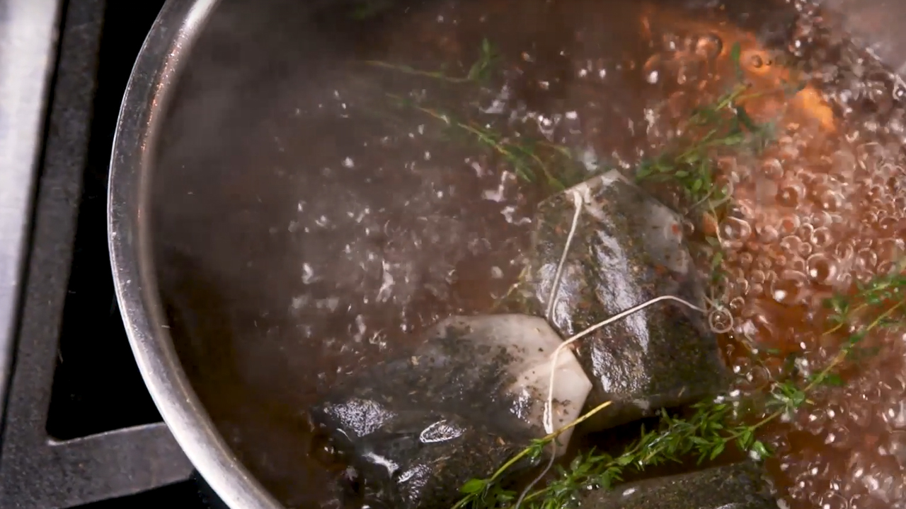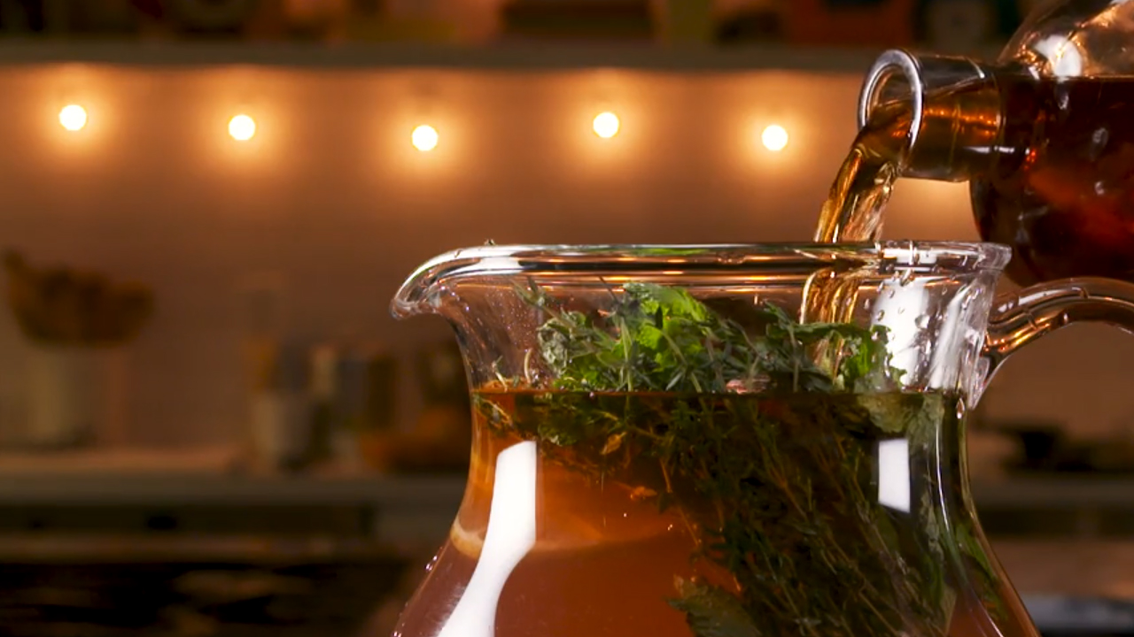 1 Done | Подготовьте все ингредиенты и приготовьте основу для пунша — сироп из мятного чая и тимьяна. Вам понадобится несколько пакетиков чая, пучок тимьяна и 1 литр воды. Налейте воду в среднюю кастрюлю и доведите до кипения. После этого добавьте чайные пакетики, 8 веточек тимьяна и сахар. Дайте закипеть. |