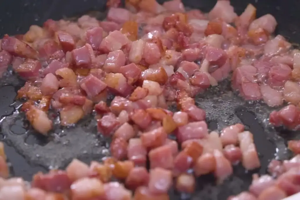 Нарезаем бекон кубиками или полосками и обжариваем на сковородке до легкой золотистой корочки.