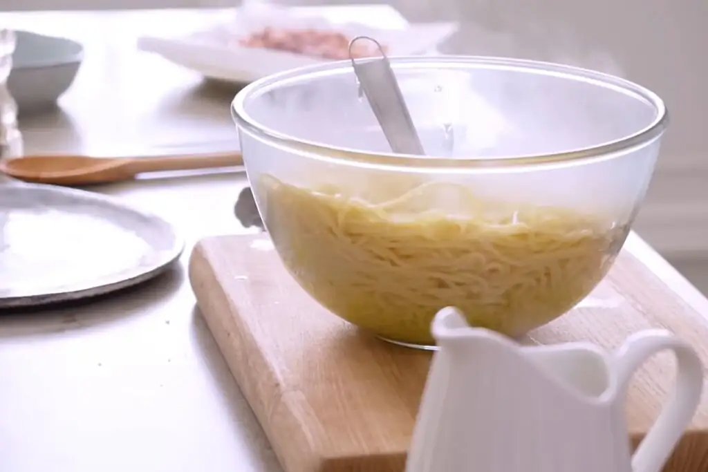 Отвариваем спагетти в подсоленной воде до состояния «al dente». Для этого с момента закипания нам понадобится около 8 минут. Немного воды после отваривания пасты отливаем в кружку. Она понадобится нам для приготовления соуса.