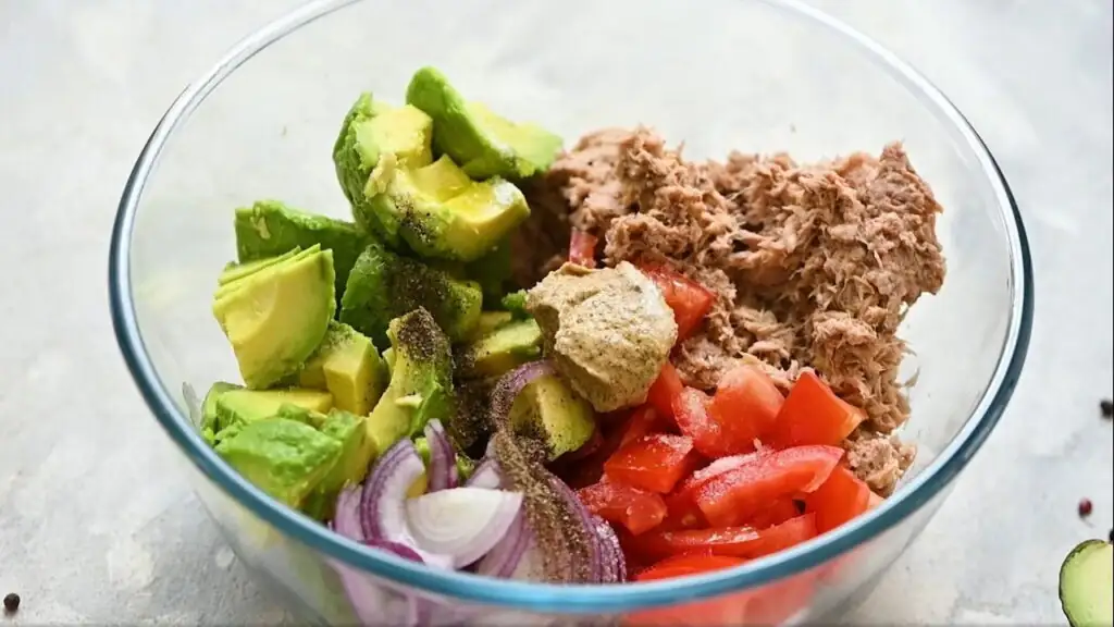 Добавьте в миску тунец, нарезанный слайсами красный лук, помидоры, авокадо, горчицу, оливковое масло, сок лимона, соль и перец.