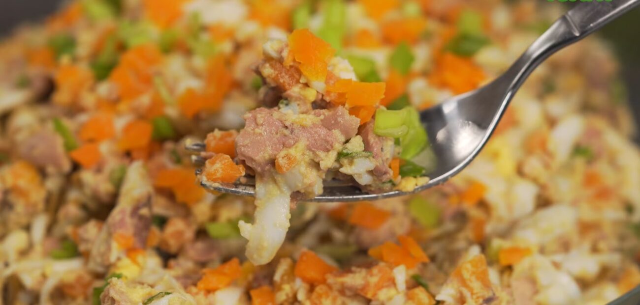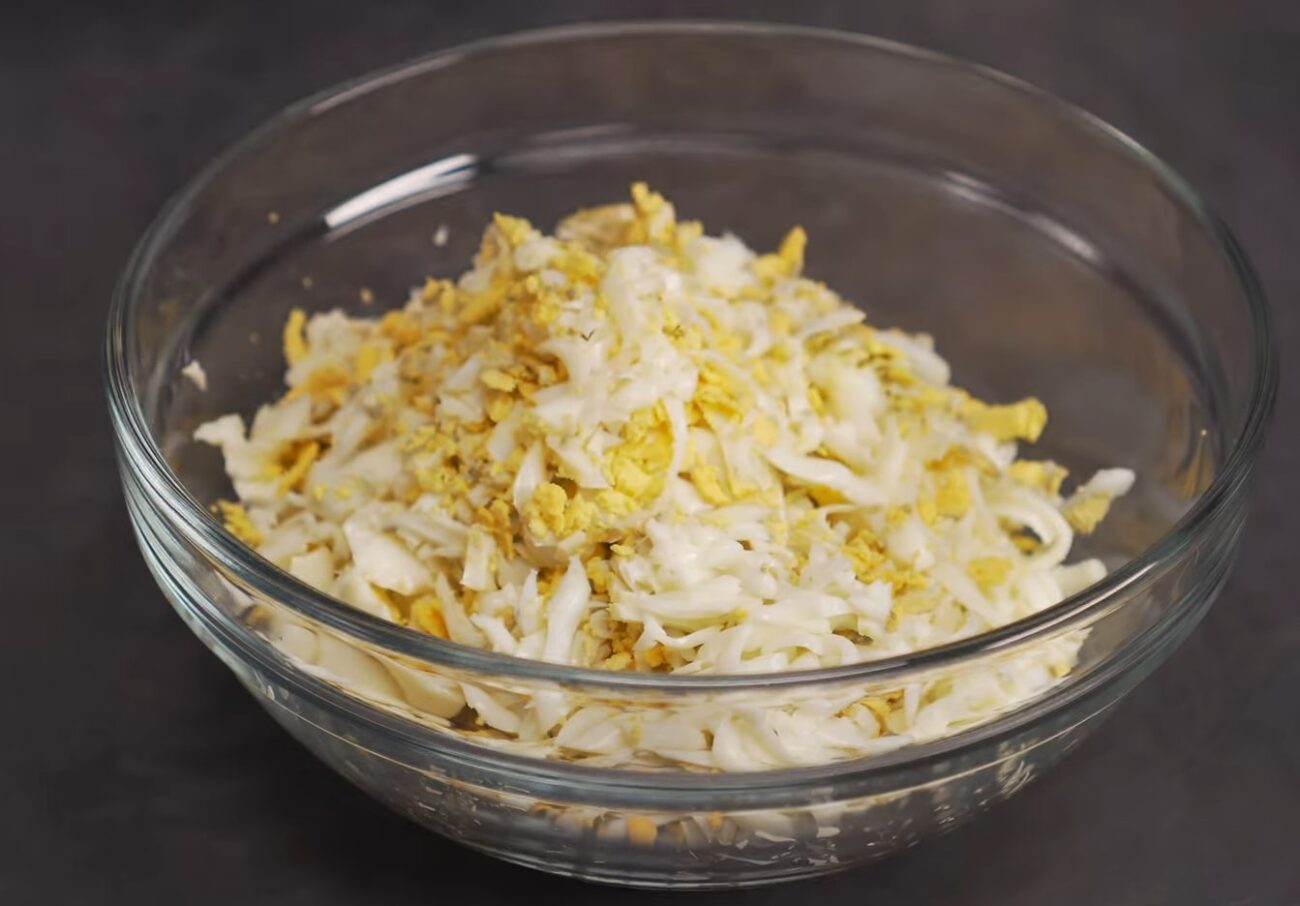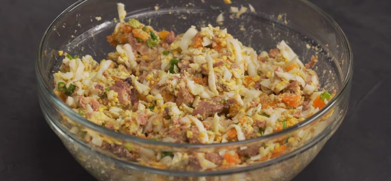 4 Done | Заправьте салат майонезом и тщательно перемешайте. Подготовьте подходящую посуду для подачи салата, лучше всего для сервировки использовать кондитерское кольцо. Для разнообразия к салату можно добавить маслины или консервированный горошек. |