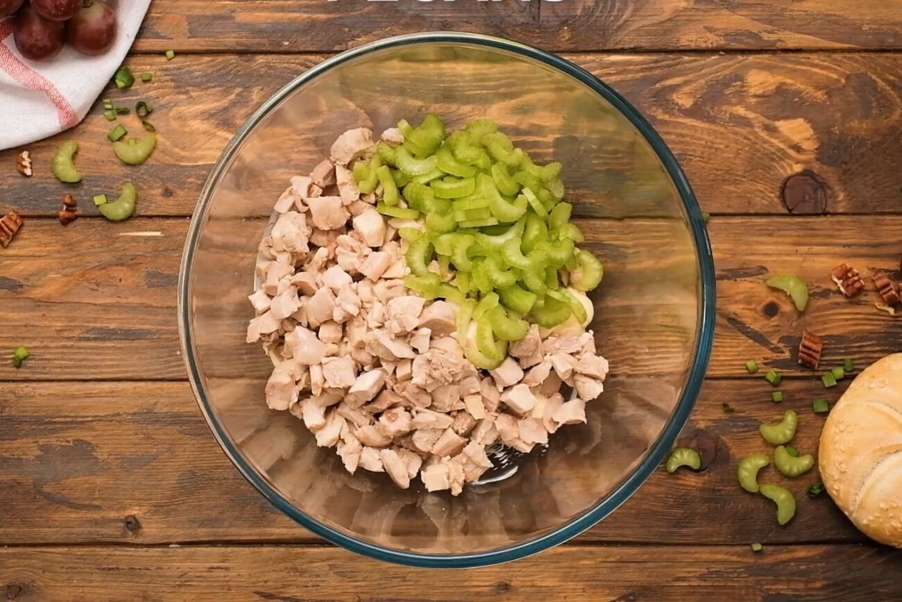 2 Done | Добавьте к ним нарезанные небольшими кубиками сельдерей и куриное мясо. Желательно. чтобы кусочки были приблизительно одного размера, это улучшит вкусовые свойства салата. |