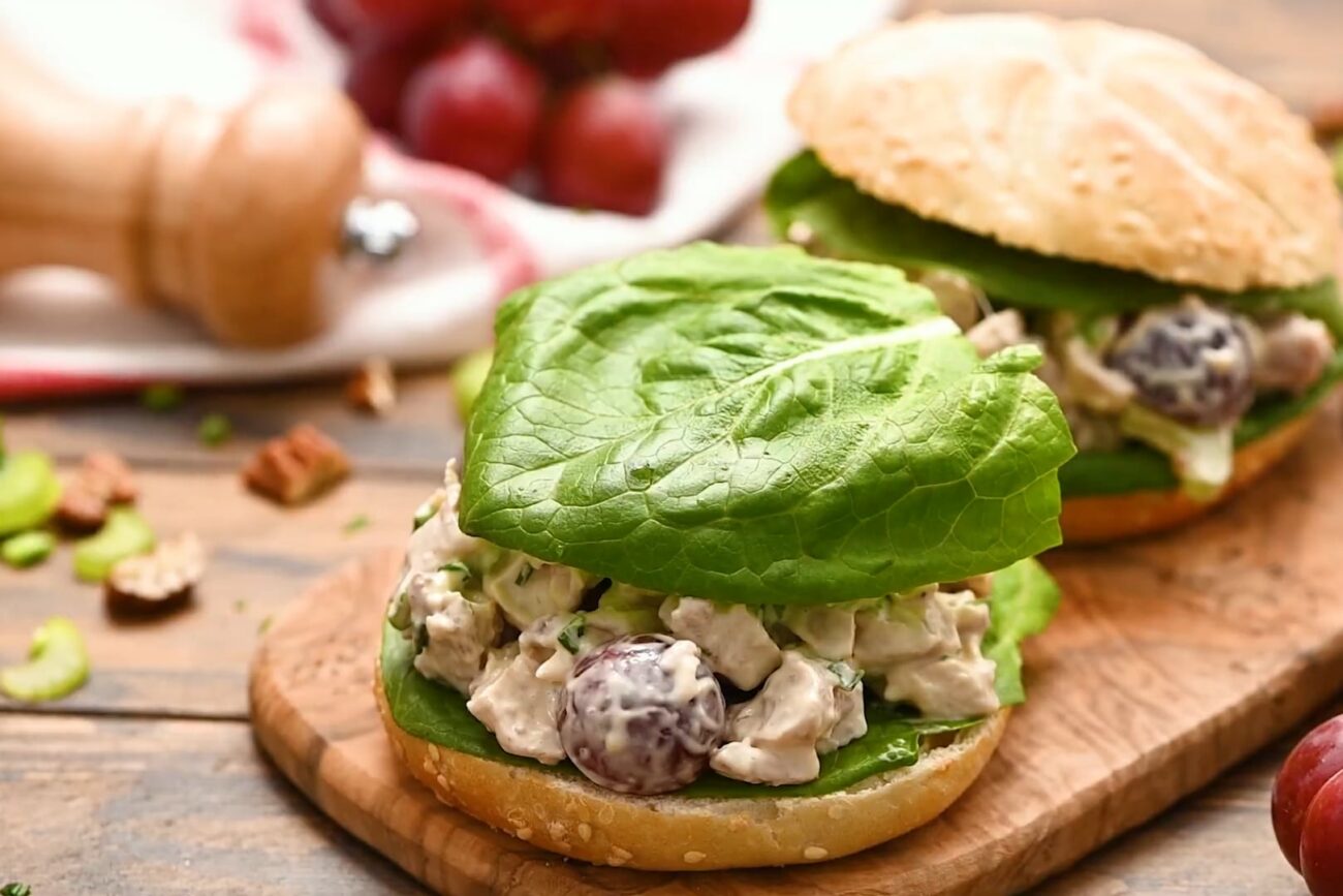 5 Done | Для пикника будет отличным вариантом подать салат с виноградом на булочках для сэндвичей с листьями свежего салата. |