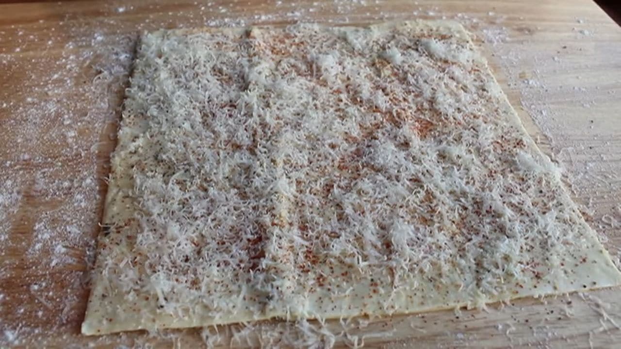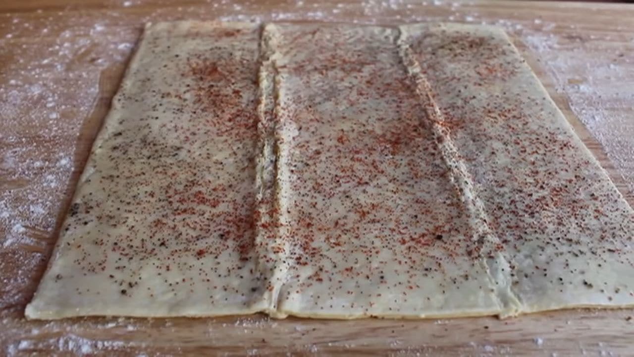 2 Done | Раскатайте тесто в плоский лист; смажьте оливковым маслом и добавьте специи. |