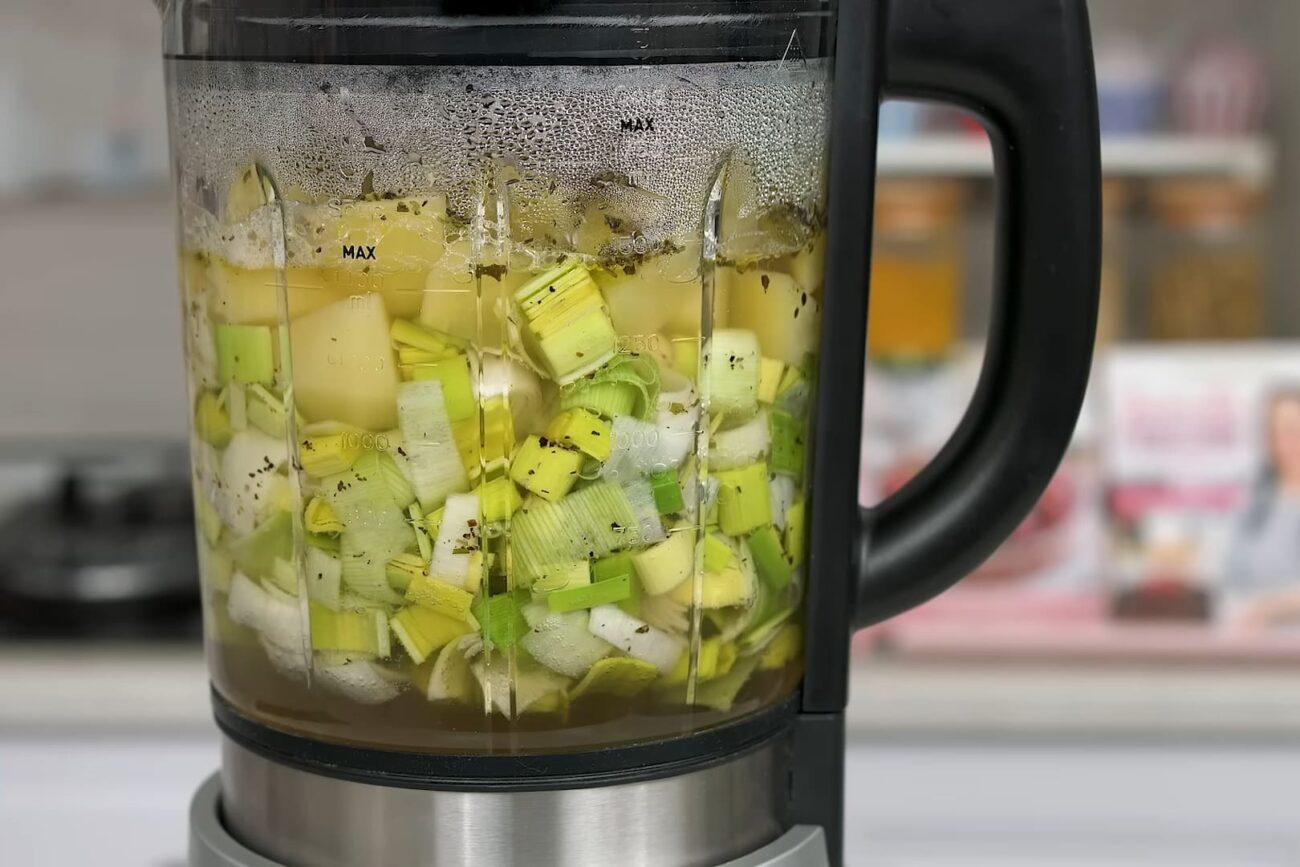 2 Done | В овощном бульоне отвариваем картофель и лук-порей до готовности. Даем немного остыть. Затем выливаем суп в блендер. Добавляем чеснок, травы, солим и перчим. |