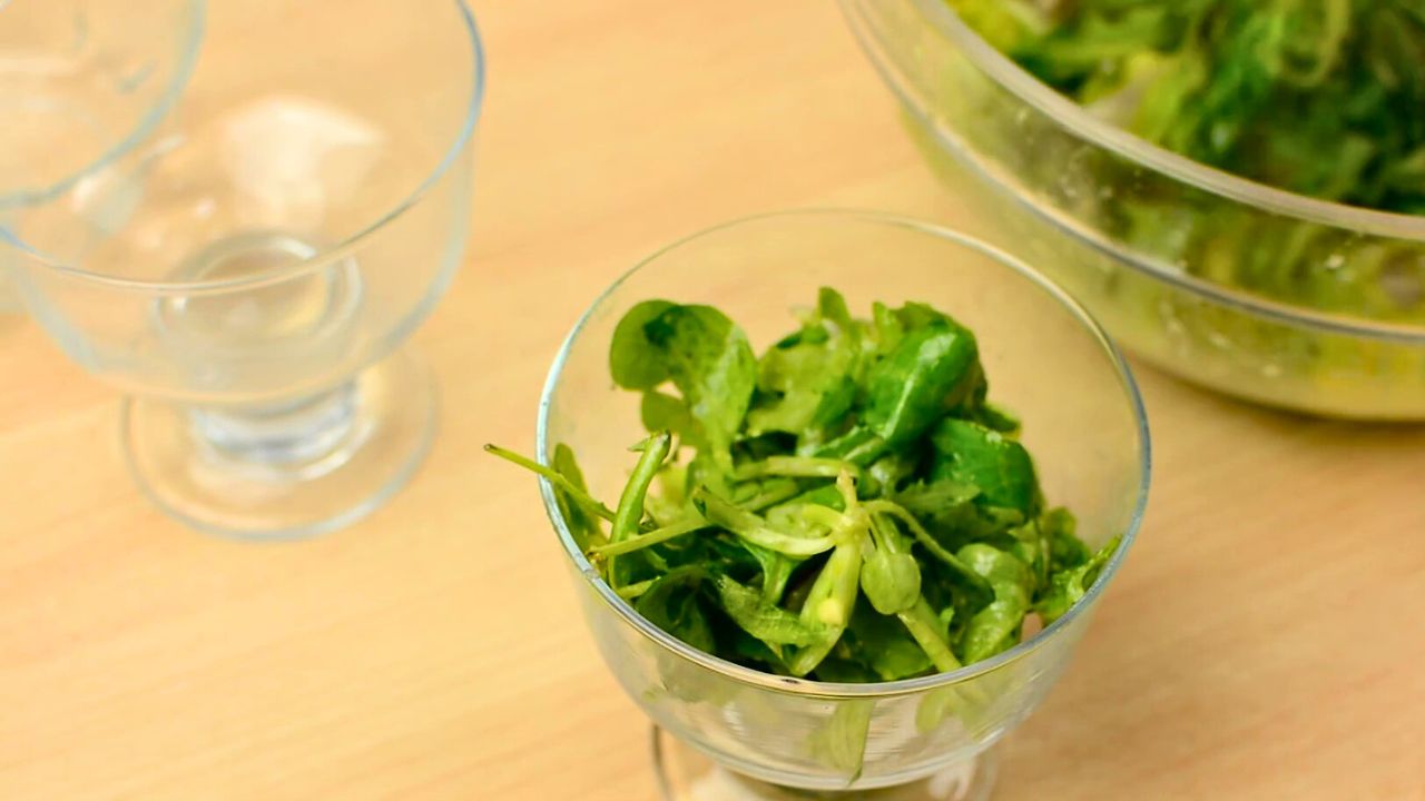 - 300-400 грамм Смесь из салатных листьевМы использовали салат канон и руколу. Также можно взять айсберг, латук, фризе и другие листья на свой вкус.