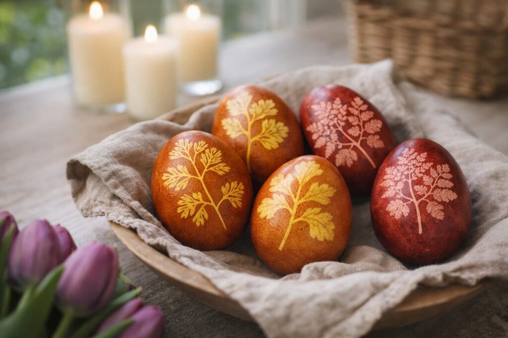 Цей спосіб — чудовий приклад того, як природа сама стає художником. У техніці використовують натуральний барвник із лушпиння цибулі, а перші весняні листочки залишають на шкаралупі дивовижний рослинний відбиток.