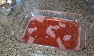 • У мисці змішуємо 2 пакети желатину з 1 склянкою окропу до повного розчинення.