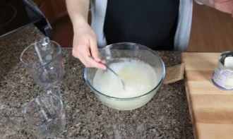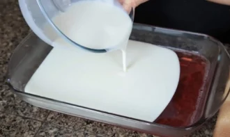 • Додаємо в суміш згущене молоко разом зі склянкою холодної води та ретельно все перемішуємо до розчинення. Кремовий шар готовий. Тепер залишаємо його на 45 хвилин за кімнатної температури.