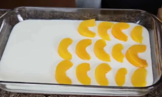 • Робимо першу частину желе (170 г) зі смаком персика відповідно до інструкцій на упаковці. Налийте розведене желе в скляну форму розміром приблизно 23 на 33 см. Розмір форми може бути будь-яким, залежно від кількості десерту та його товщини. Охолоджуємо до готовності (1 - 2 години).