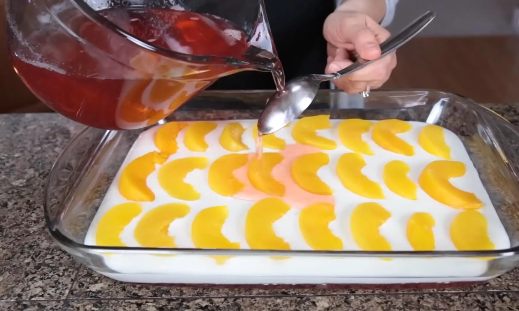 • Ставимо на 5 хвилин у холодильник, і потім кладемо шматочки нарізаного персика зверху. Тепер переміщаємо все в холодильник до повного охолодження.