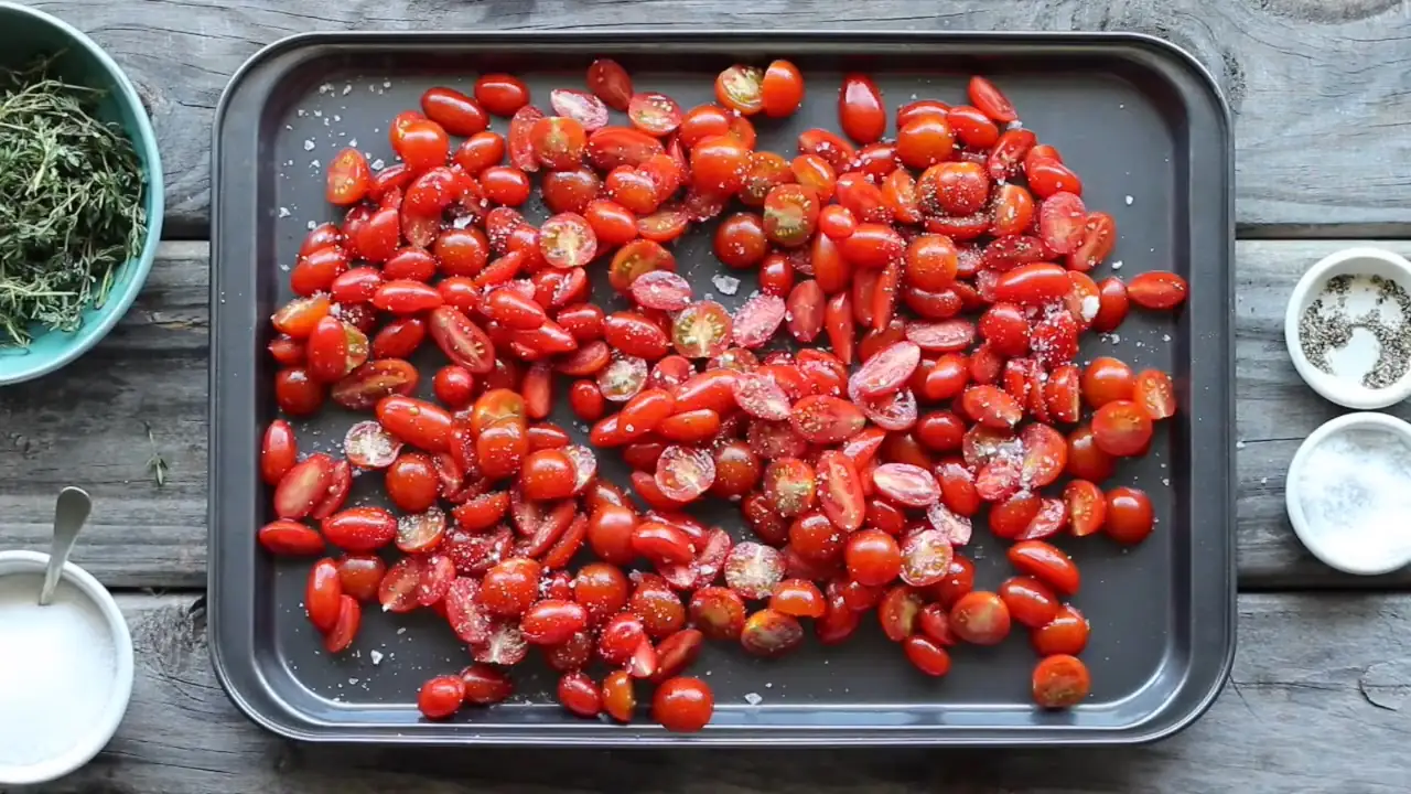 Щоб приготувати в'ялені томати, візьміть 600 грамів помідорів чері або коктейльних, розріжте навпіл і відправте на деко. До помідорів додайте сіль і перець за смаком, 1 чайну ложку цукру, свіжого кмину, все це зверху полийте невеликою кількістю червоного виноградного оцту і 60 мл оливкової олії. Відправте деко з томатами в духовку на 50 хвилин за 180 градусів.