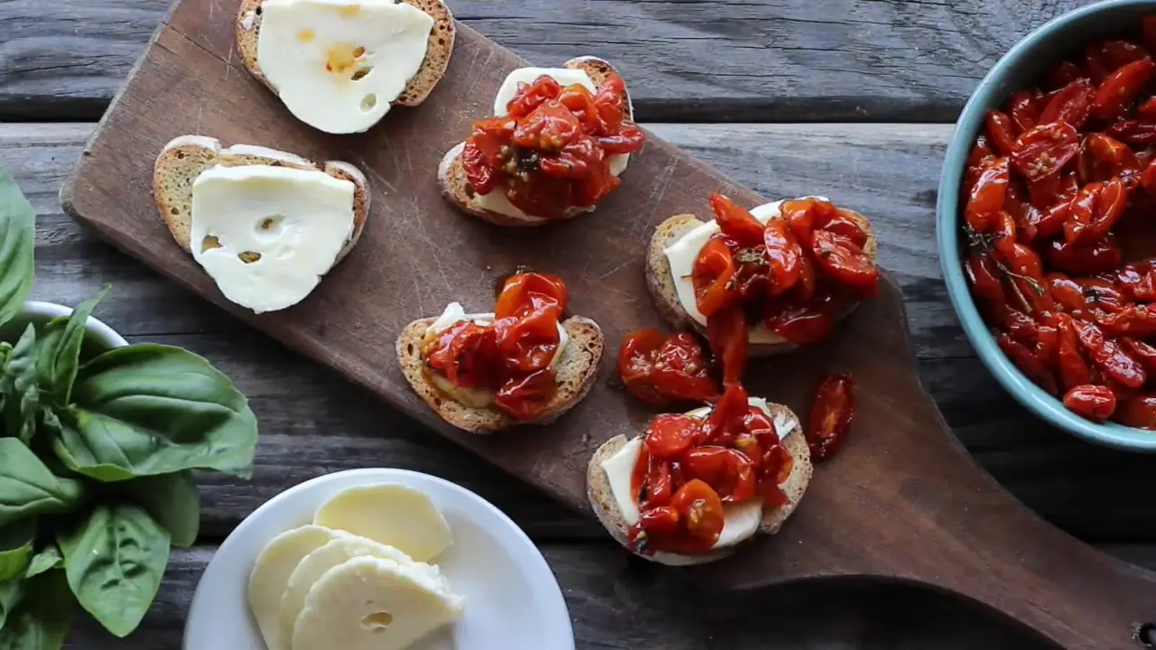 Італійці краще за всіх знають, що таке легкий перекус. Ці смачні та хрусткі брускети з в’яленими помідорами, моцарелою і базиліком дійсно сподобаються вам і вашим гостям. В’ялені томати також чудово пасують до свіжоприготованої пасти зі скибочками моцарели та базиліку. Приємного апетиту!