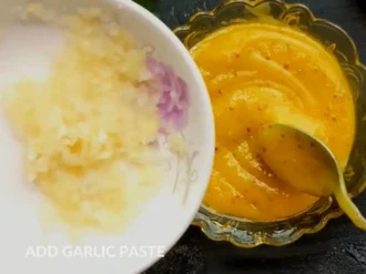 Коли ви не бачитимете вільної олії на поверхні, і емульсія стане досить щільною, можна додати перетертий із сіллю часник.