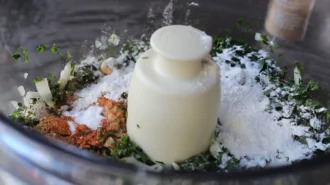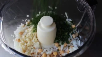• У кухонний комбайн кладемо боби нуту, цибулю, петрушку.