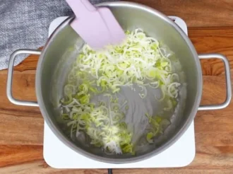 Щойно масло повністю розтане, додайте тонко нарізану цибулю-порей. Готуйте, поки вона не стане м'якою.