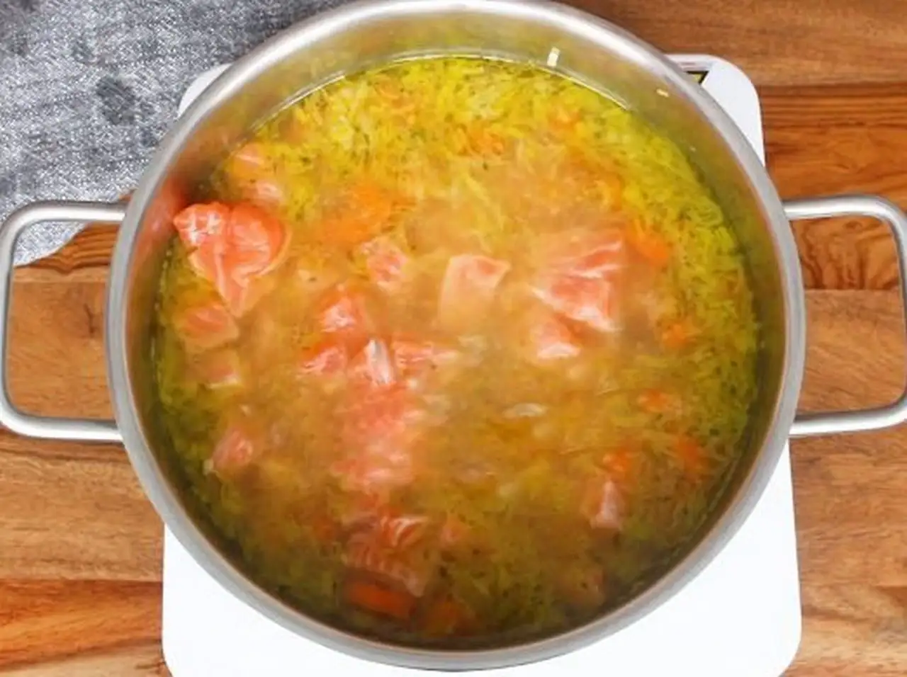 Додайте моркву та картоплю. Додайте рибний бульйон. Накрийте каструлю кришкою і доведіть до кипіння. Варіть на повільному вогні, поки овочі майже не приготуються.