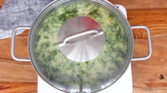 Приправте, додавши сіль і перець. Помішайте. Додайте кріп. Вимкніть. Накрийте кришкою і тримайте закритим протягом 2 хвилин.