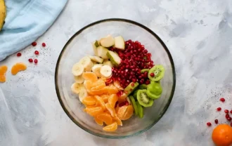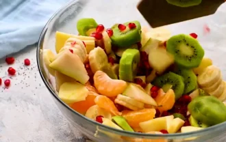Фруктовий салат – яскраві, смачні та корисні ласощі, які відразу асоціюються з літом і сонцем, незалежно від погоди на вулиці. Варіантів салатів із фруктів незліченна кількість: ви можете імпровізувати і додавати найрізноманітніші плоди і ягоди, роблячи потрібні акценти: солодкуваті, кислуваті або гіркуваті. Нижче ми пропонуємо рецепт фруктового салату, який можна готувати в будь-який сезон – усі ці фрукти доступні цілий рік. Тому ви легко прикрасите ним новорічний стіл і зможете подавати, як соковитий, освіжаючий десерт у найспекотніші дні літа. Кількість інгредієнтів для заправки коригуйте залежно від розміру обраних вами фруктів. Якщо вони маленькі – занадто багато заправки не знадобиться.