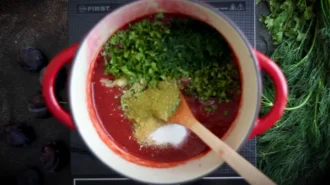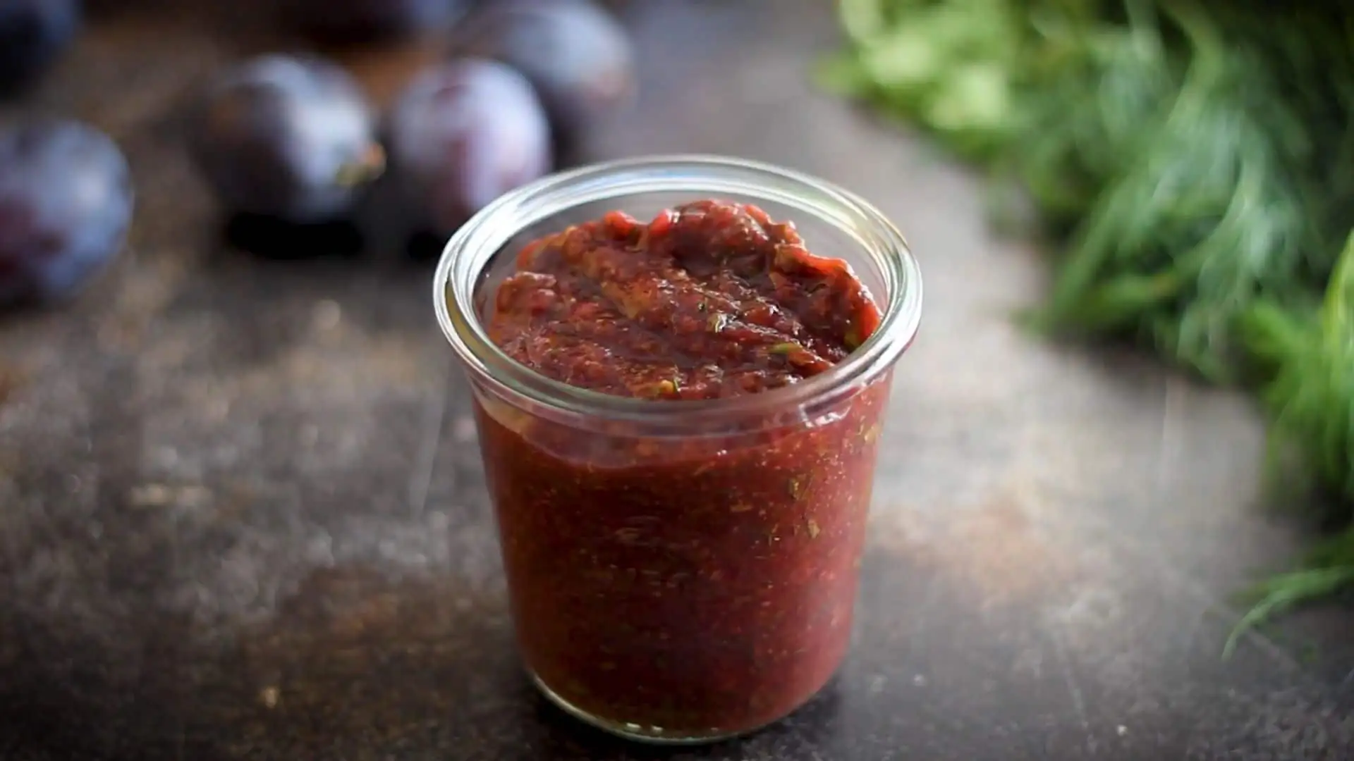 • Перетріть сливи через сито, перелийте суміш у кухонний комбайн або використовуйте ручний блендер, щоб отримати однорідне пюре. Додайте лимонний сік, олію, часник, естрагон, хмелі сунелі, кінзу, гранатовий сік, коріандр, сіль, червоний і чорний перець.