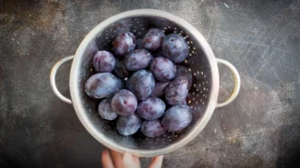 • Заповніть велику каструлю наполовину водою і доведіть до кипіння на середньому вогні. Занурте сливи у воду на 1 хвилину, потім злийте і промийте під проточною холодною водою.