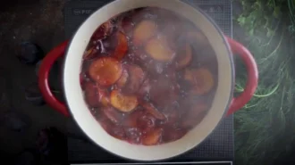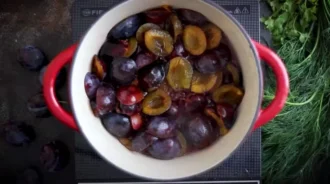 • Зменшіть вогонь до мінімуму і варіть під кришкою, поки сливи не стануть дуже м'якими, близько 5 хвилин.