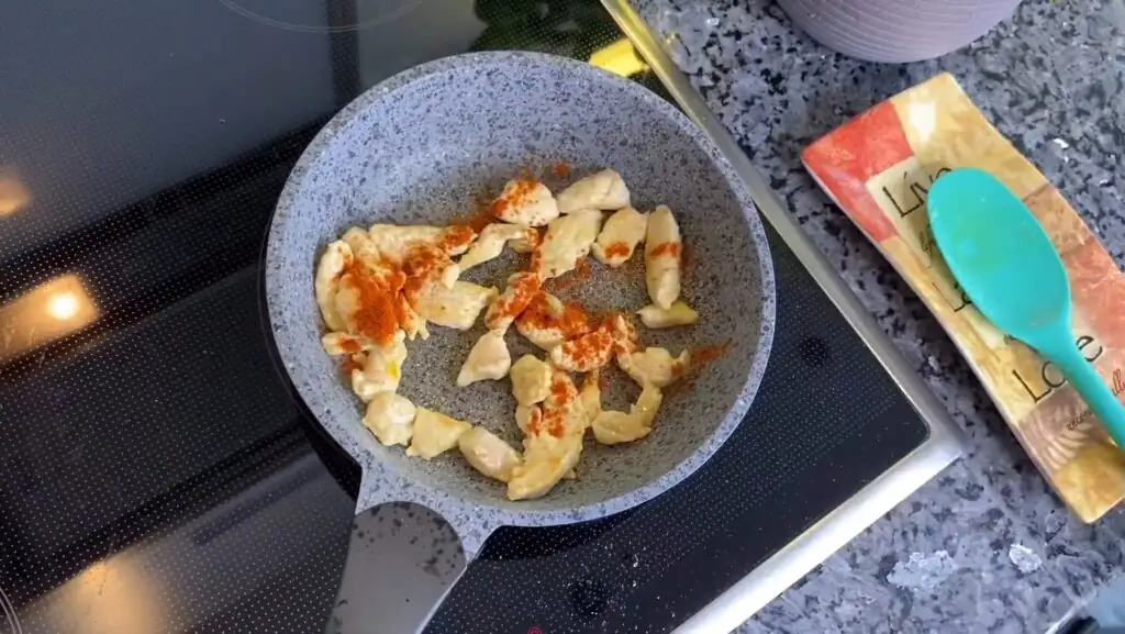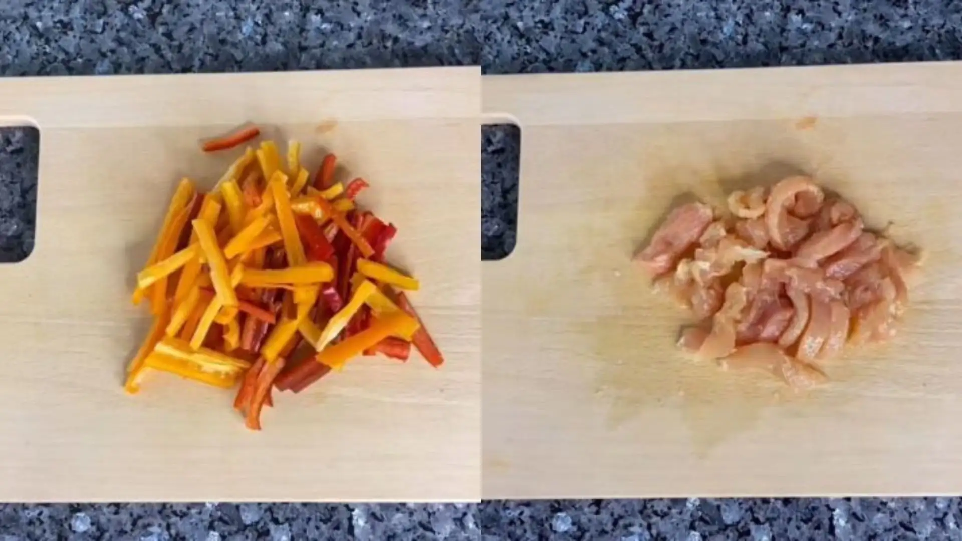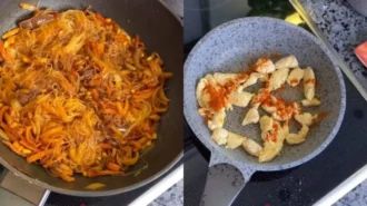 • Потім до всіх овочів додати локшину, додати трохи соєвого соусу і зняти з вогню. Поки локшина вбирає всі аромати, приготуйте куряче філе. Обсмажте на сковорідці з рослинною олією близько 5 хв. Додайте трохи часникової приправи, а також паприку і зніміть з вогню.