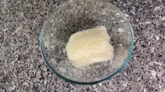 • Тим часом приготуйте скляну локшину. Просто додайте фунчозу у велику миску і залийте дуже гарячою водою. Дайте воді вбратися протягом 5 хвилин.