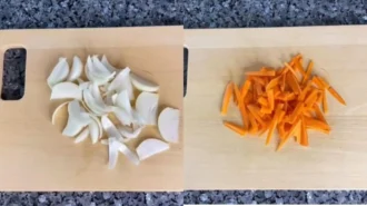 • Цибулю порізати півкільцями, а моркву дрібною соломкою.