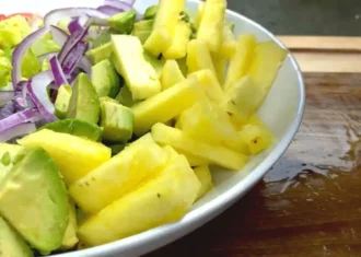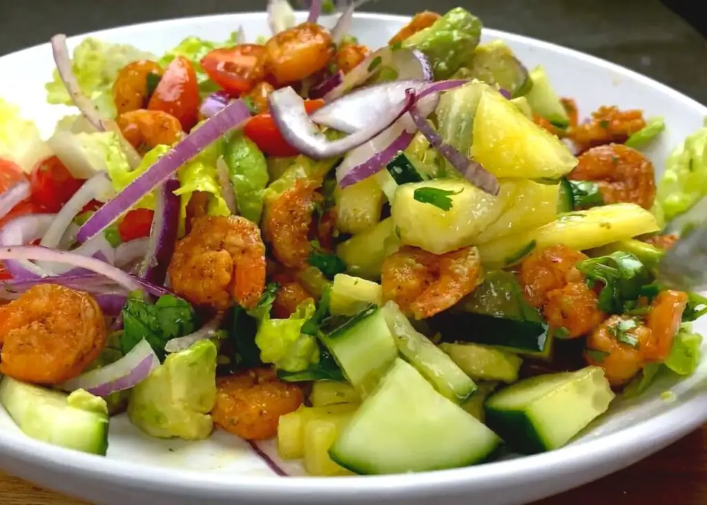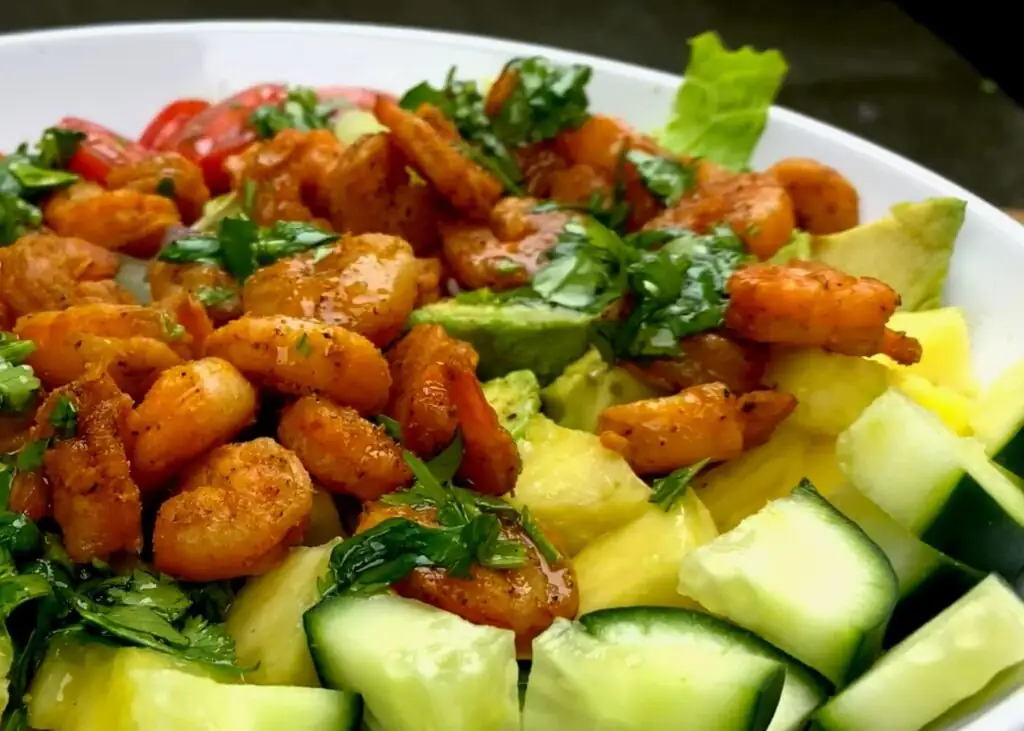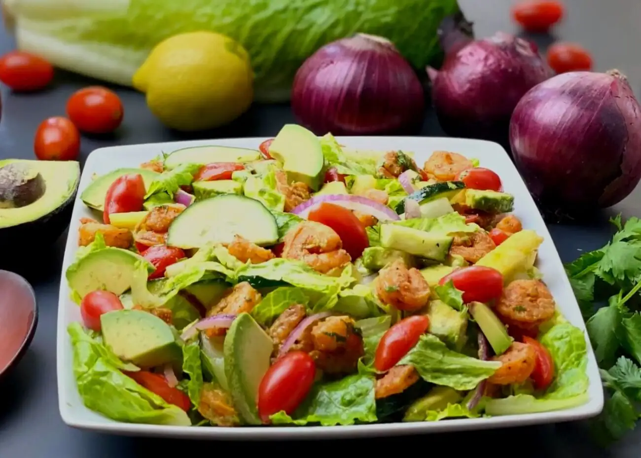 Салат із креветок і авокадо не тільки дуже корисний – це по-справжньому вдале поєднання смаків! Ніжний аромат морепродуктів і м’який горіховий присмак авокадо ідеально підкреслюють одне одного. Смакоароматичну композицію своєю кислинкою доповнюють томати, а салат і цибуля роблять страву справді літньою і свіжою. І при всьому цьому страва готується дуже швидко і просто: здивувати сім’ю таким оригінальним салатом зможе навіть кулінар-початківець.