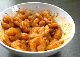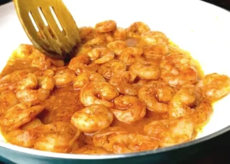 Ретельно змішуємо всі інгредієнти: креветки стануть красивого золотистого кольору.