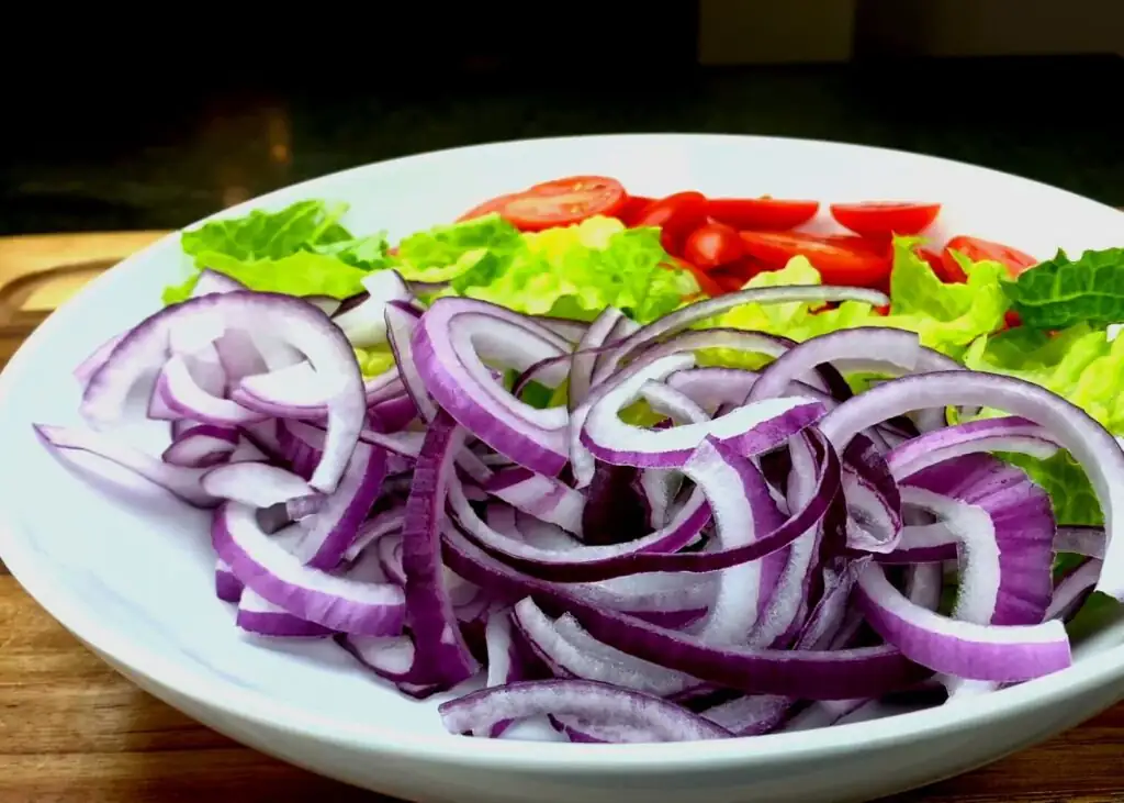 Помідори нарізаємо половинками. Салат - крупно рубаємо, а цибулю - нарізаємо тонкими півкільцями.