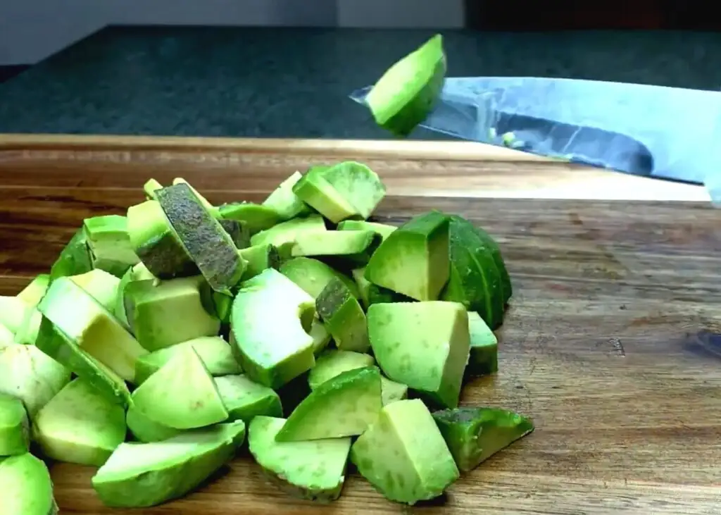 Авокадо чистимо, видаляємо кісточки. Спочатку розрізаємо плід на четвертинки, а потім кожну з них - на скибочки, як на фото.