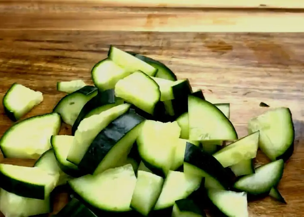 Огірок нарізаємо чвертькільцями.