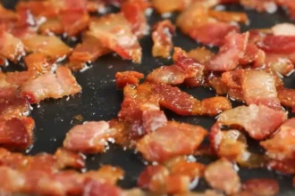 Смужки бекону ріжемо невеликими скибочками й обсмажуємо на сковороді до золотистої скоринки. Періодично струшуйте їх, щоб не підгоріли. Приберіть з вогню і дайте бекону охолонути.