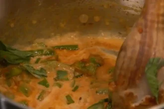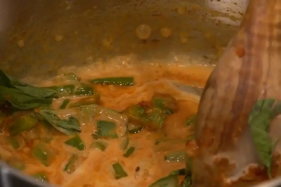 • Основа для заправки: у сотейник покладіть арахісову олію, червоний перець чилі та червону пасту каррі. На повільному вогні кілька хвилин поваріть до появи аромату. Додайте часник, базилік, болгарський перець і рибний соус. Готуйте, помішуючи, ще близько 2 хвилин. Влийте кокосове молоко і доведіть до кипіння. Помішуючи, доведіть соус до густої коністенції - маса має зменшитися приблизно вдвічі. Зніміть із вогню й охолодіть.