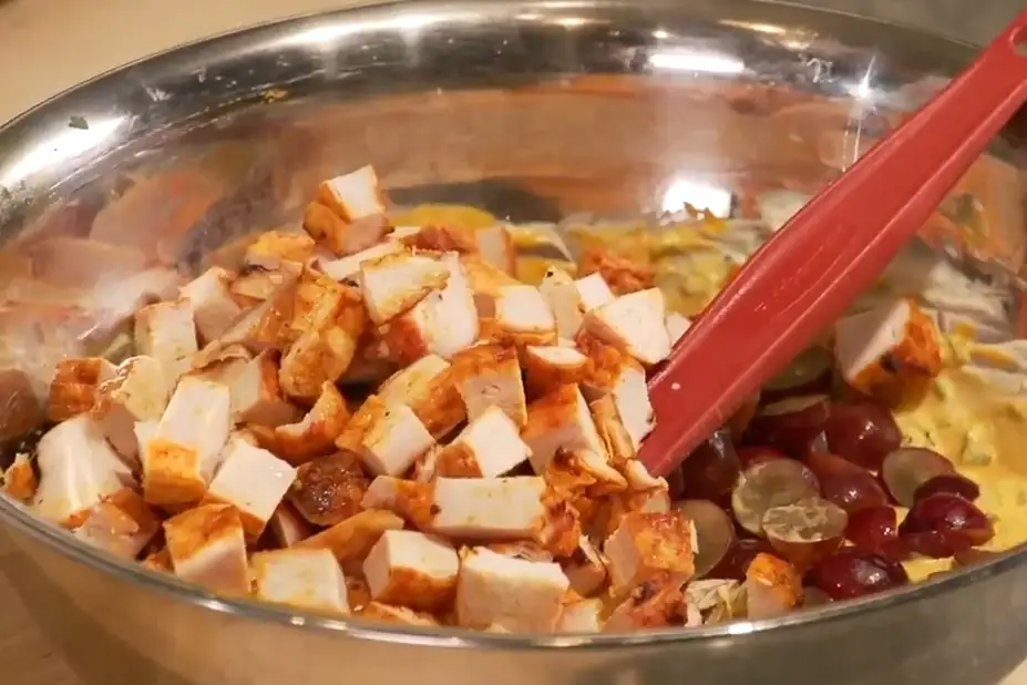 Наприкінці додаємо кубики курки та змішуємо з салатом.