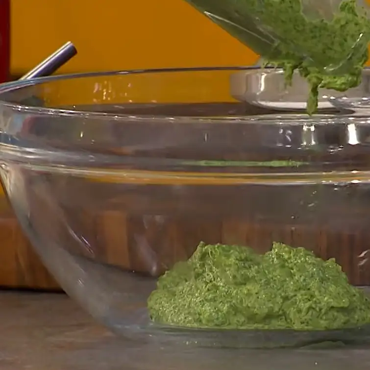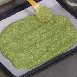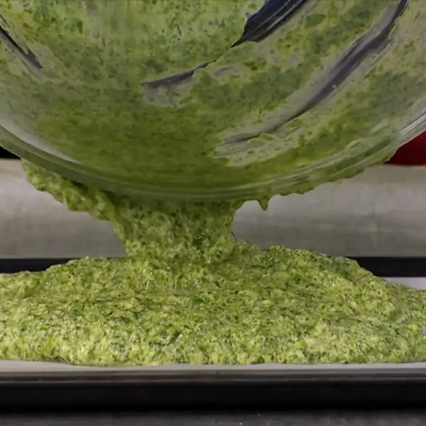 Висота коржа має бути не більше 1 см. Зручніше взяти деко більшого розміру й орієнтуватися на об'єм шпинатної маси. Розігріваємо духовку до 180 градусів і ставимо випікатися на 10 хвилин. Важливо не перетримати корж, інакше він буде кришитися, а нам потрібен гнучкий продукт, щоб можна було легко згорнути рулет. Готовому коржу даємо охолонути, акуратно відокремлюємо від пергаменту і повертаємо назад для складання.