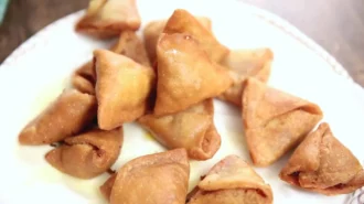• Щойно колір самси став золотистим, виловлюємо шматочок і кладемо на паперовий рушник. Щойно зайва олія стекла, самса готова до подачі. Приємного апетиту!