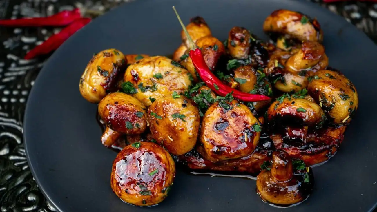 Яскраві, смачні, соковиті печериці прикрасять будь-який святковий стіл. Свіжий рецепт знайомих усім продуктів. Приготуйте його для гостей, здивуйте другу половинку або побалуйте себе. Ситні карамелізовані гриби підійдуть як для теплої закуски, так і для підгарніровки до барбекю і не тільки.
